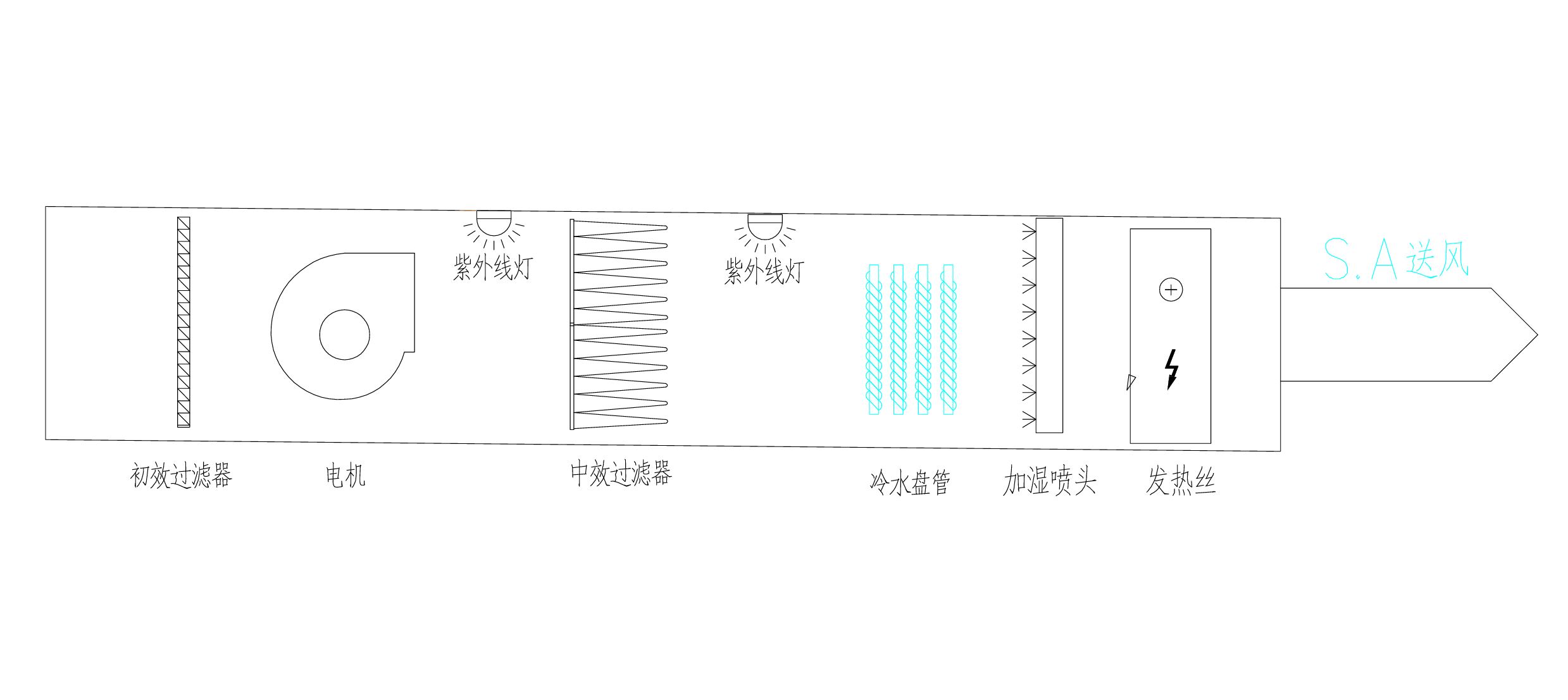 组合式空调机组是高质量空气净化恒温恒湿系统的重要组成部分,国内很多品牌空调都有生产,使用场所一般相对空气质量要求较高的场所,如:医院手术室、医药车间及精密电子元件等。组合式空调由:出/入风口、低效/中效/高效过滤器、送风机、发热丝、加湿器、紫外线杀菌灯、冷冻水盘管及箱体等组成。常见的结构如下图: