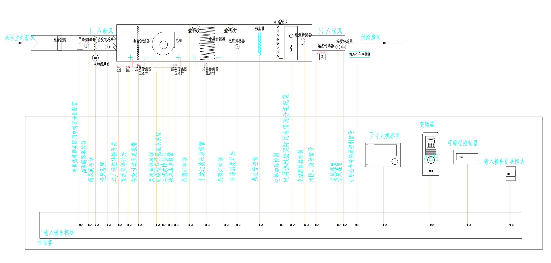 5.空调送风机与排风机、电加热、电热加湿连锁;启动时,先启动排风机,再启空调送风机、电加热、电热加湿;关闭时则反之。